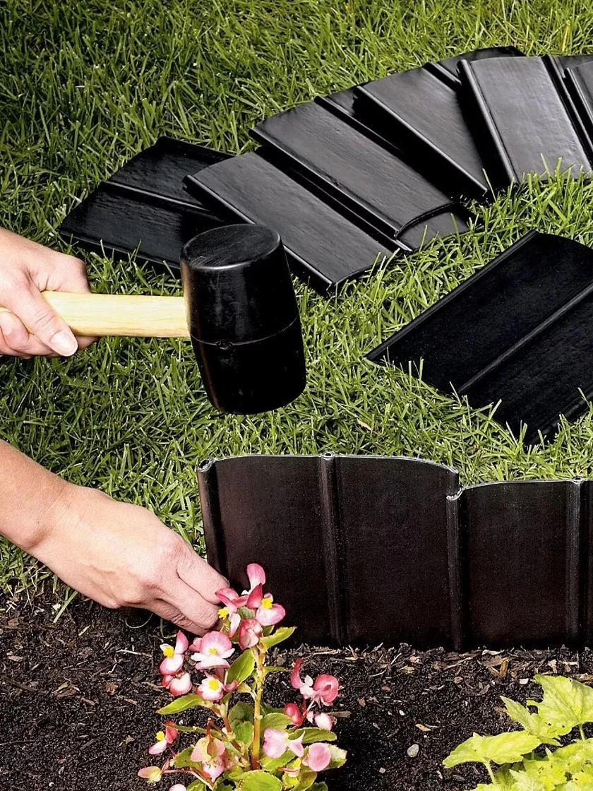 This is the quickest, easiest system you’ll find for defining an edge between your lawn and flower beds or garden. Simply pound each interlocking piece into the ground with a rubber mallet; in most soils there’s no need for cutting, trenching or tearing up sod. To turn a corner, just bend the sections to form the angle you need.