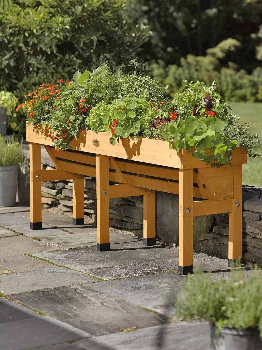 Place the Wallhugger VegTrug™ along a fence or wall to create a tidy and convenient vegetable growing area in a very small space. It’s deeper at the back for large plants like tomatoes, and shallower in front for greens, herbs and other small plants. Grow plants at an easy, ergonomic height; no bending or kneeling to plant, tend and harvest. Wheelchair accessible. The elevated bed means no weeds and fewer pests, too. Great for apartment or condo dwellers with limited space — and you can take it with you if you move! Includes a fitted fabric liner to keep soil contained while letting excess water drain. Plastic feet protect wood from wet surfaces. Quality construction and easy assembly.